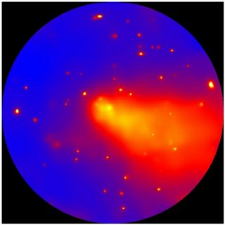 For the first time, an international team of astronomers has found observational evidence of shock waves and radio-emitting rings rippling around a giant galaxy cluster some 600 million light years away. Observations made with the VLA (Very Large Array) radio telescope in New Mexico and with the European Space Agency's XMM-Newton x-ray observatory have confirmed the presence of both giant radio-emitting rings and magnetic shock waves around the galaxy cluster Abell 3376. As reported in a recent issue of the journal Science, x-ray observations of Abell 3376 suggests that these emissions must have originated after the violent collision of smaller sub-clusters within the larger main cluster. These collisions are so powerful that researchers estimate that the resulting energy would be enough to keep our own sun alive and kicking for another 20 sextillion years. That's a 2 trailed by 22 zeroes. Particle physicists and cosmologists alike are still puzzled over the origin of Ultra High Energy Cosmic Rays. Often the purview of science fiction, in reality, cosmic rays are highly-energetic atomic particles kicked up to speeds approaching that of light. While it's certain that the cluster Abell 3376 must be responsible for at least some cosmic rays, whether it is generating these ultra high energy rays is still open to debate. Ultra High Energy Cosmic Rays --- some 100 million times more energetic than such particles created in the largest accelerators here on earth; have been detected by ground-based astronomers. But only future highly sensitive cosmic ray observatories will be able to determine if this far-flung galaxy cluster is the source of such ultra high energy particles. The bonafide origin of Ultra High Energy Cosmic Rays remains one of cosmology's greatest conundrums. The above x-ray image from XMM-Newton shows a bullet-like supersonic shock of x-rays emanating from gas superheated by Abell 3376's sub-cluster collisions. Image credit: Joydeep Bagchi, IUCAA, ESA